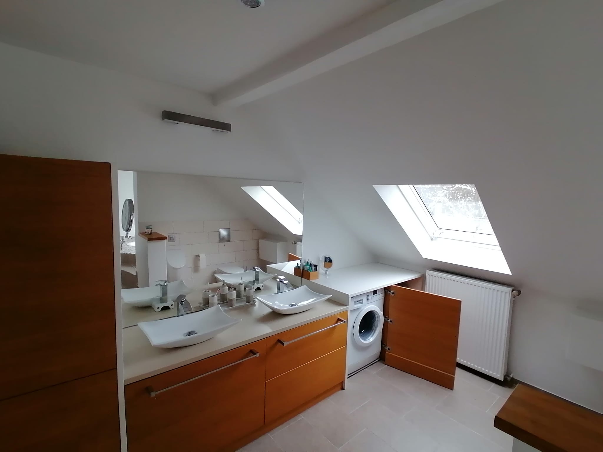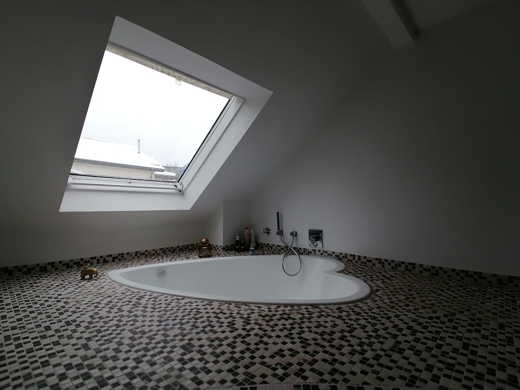 Ein Highlight ist das riesige Badezimmer, in welchem Ihnen der perfekte Start in den Tag gelingt! Das Bad glänzt mit einer ebenerdigen Regendusche sowie einer Badewanne unter dem Dachfenster.